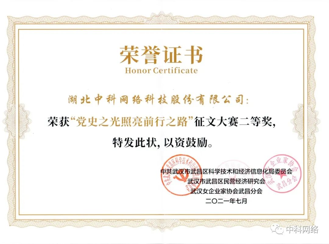 熱烈祝賀湖北中科網(wǎng)絡(luò)科技股份有限公司榮獲“黨史之光照亮前行之路”征文大賽二等獎