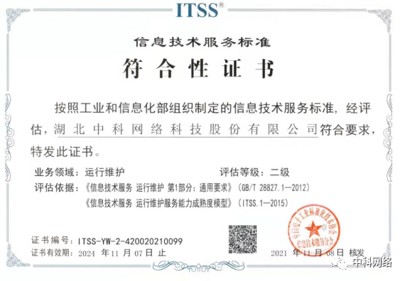 喜訊:中科網(wǎng)絡(luò)成功取得“ITSS信息技術(shù)服務(wù)標準符合性二級”證書