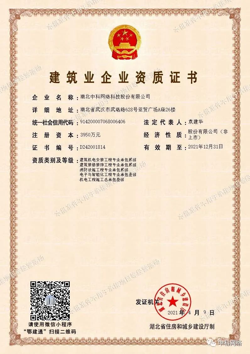 喜訊:中科網(wǎng)絡(luò)成功獲得“機電工程施工總承包叁級”證書